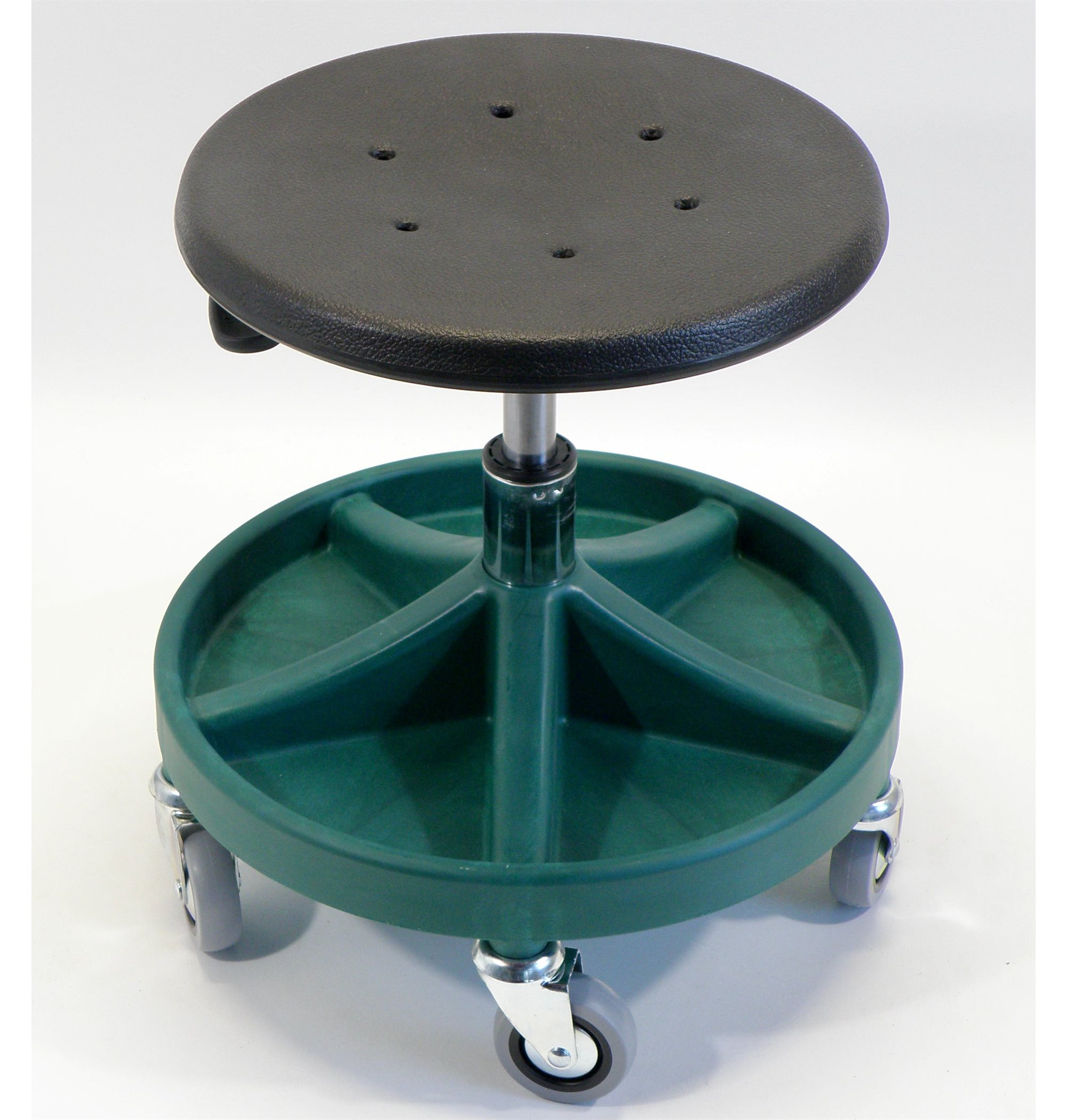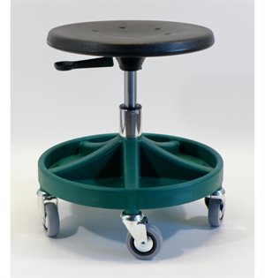 En smart og robust taburet med bekvemt sæde i PU-skum. Velegnet til dig, der ellers måtte sidde på hug eller stå foroverbøjet. Fodkryds i nylon med dobbelt forkant, fem rum til skruer, bolte m.m. Fem stk. 75 mm. specialhjul med lille off-set, der modvirker tiltning når hjulene drejer ind under fodkrydset. Højder er målt fra gulv til overkant sæde.